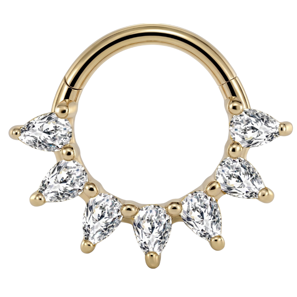 Dodaj swojej biżuterii luksusowego charakteru dzięki Stalowemu Clickerowi Segmentowemu zdobionemu siedmioma lśniącymi cyrkoniami. Unikalny szlif kamieni w kształcie łezek (pear cut), ułożonych w promienistą kompozycję, tworzy efektowną koronę, która zjawiskowo odbija światło i optycznie powiększa kompozycję Twojego piercingu.