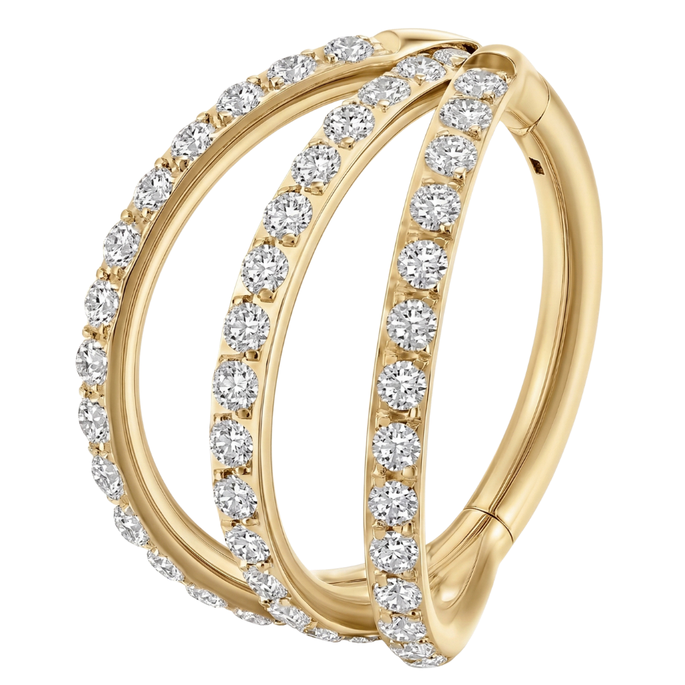 Ten Stalowy Clicker Segmentowy wyróżnia się unikalną, podwójną konstrukcją, gdzie oba rzędy zostały gęsto wysadzane lśniącymi cyrkoniami. To idealne rozwiązanie dla osób, które chcą dodać swojej stylizacji objętości i luksusowego blasku bez konieczności wykonywania dodatkowych przekłuć. Wykonany z wysokiej jakości stali chirurgicznej 316L, kolczyk łączy trwałość z eleganckim wykończeniem. Wygodny mechanizm typu clicker pozwala na błyskawiczną wymianę biżuterii bez użycia narzędzi, zapewniając jednocześnie pewne i bezpieczne zapięcie. Ten podwójny ring to doskonała biżuteria do piercingu ucha, która najlepiej prezentuje się w przekłuciach typu: conch, helix.